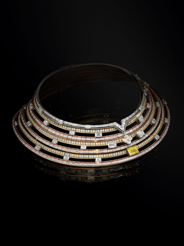 A more literal interpretation from Chapter I, Plants is embodied by a transformable necklace set with leaves crafted from over 400 custom-cut emeralds and diamonds.