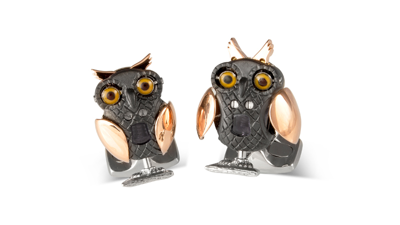 Hero pieces include a pair of cufflinks in the ‘Mechanicals’ category, which feature highly polished blades sitting on micro-bearings that whirl into action when blown on, and uniquely fun jewels in the ‘Boys Toys’ section, such as a pair of shotgun cufflinks featuring repelling magnets that open the barrels and reveal gold cartridge caps when the lever is flicked.