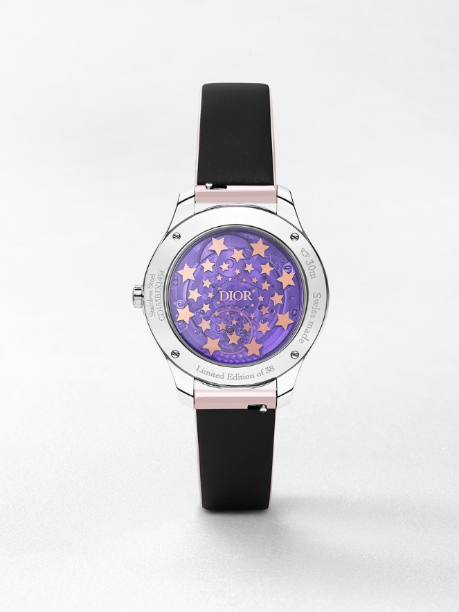 A translucent purple sapphire crystal caseback with pink gold-colored metallisation on the stars takes the circus theme to the next level.